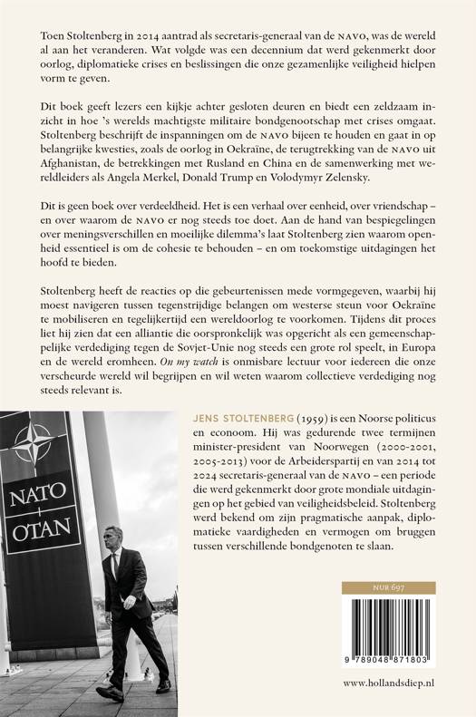 Stoltenberg heeft de reacties op die gebeurtenissen mede vormgegeven, waarbij hij moest navigeren tussen tegenstrijdige belangen om westerse steun voor Oekraïne te mobiliseren en tegelijkertijd een wereldoorlog te voorkomen. Tijdens dit proces liet hij zien dat een alliantie die oorspronkelijk was opgericht als een gemeenschappelijke verdediging tegen de Sovjet-Unie nog steeds een grote rol speelt, in Europa en de wereld eromheen. On my watch is onmisbare lectuur voor iedereen die onze verscheurde wereld wil begrijpen en wil weten waarom collectieve verdediging nog steeds relevant is.