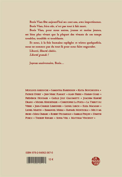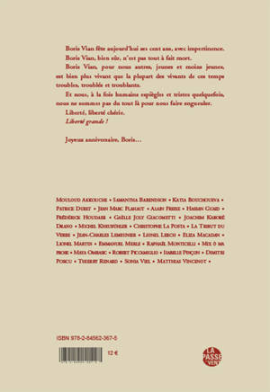 Boris Vian fête aujourd’hui ses cent ans, avec impertinence. Boris Vian, bien sûr, n’est pas tout à fait mort. Boris Vian, pour nous autres, jeunes et moins jeunes, est bien plus vivant que la plupart des vivants de ces temps troubles, troublés et troublants. Et nous, à la fois humains espiègles et tristes quelquefois, nous ne sommes pas du tout là pour nous faire engueuler. Liberté, liberté chérie. Liberté grande !