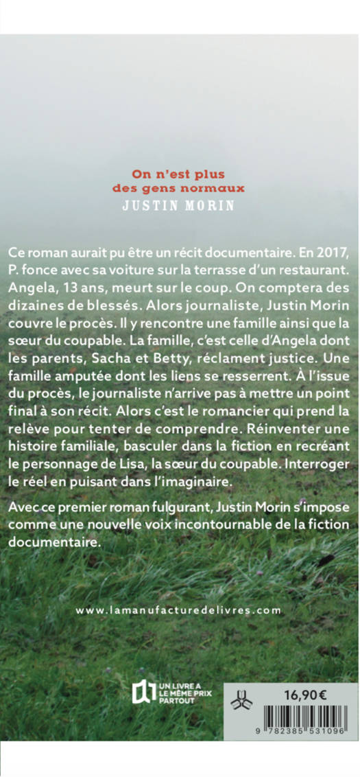 Ce roman aurait pu être un récit documentaire. En 2017, P. fonce avec sa voiture sur la terrasse d’un restaurant. Une adolescente de 13 ans, meurt sur le coup. On comptera des dizaines de blessés. Alors journaliste, Justin Morin couvre le procès. Il y rencontre une famille ainsi que la sœur du coupable. La famille, c’est celle de l'adolescente dont les parents réclament justice. Une famille amputée dont les liens se resserrent. À l’issue du procès, le journaliste n’arrive pas à mettre un point final à son récit. Alors c’est le romancier qui prend la relève pour tenter de comprendre. Réinventer une histoire familiale, basculer dans la fiction en recréant le personnage de Lisa, la sœur du coupable. Interroger le réel en puisant dans l’imaginaire.