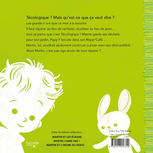 Martin a 4 ans et demi. Il est en moyenne section de maternelle. Il aime les bonbons qui piquent, mais pas trop quand même ! Il aime aussi faire des cabanes, les dinosaures gentils et les jeux vidéo. En fait, il s'intéresse à tout et il pose beaucoup de questions ! En ce moment, quelque chose intrigue particulièrement Martin, c’est l’écologie. Il entend souvent ce nouveau mot que tout le monde utilise, mais il ne comprend pas ce qu’il veut dire. Jusqu’au jour où il casse Rex, son jouet préféré. Et là, toute la famille se décarcasse pour le réparer. Stop au gaspillage, vive le recyclage !
