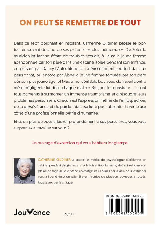 Dans ce récit poignant et inspirant, Catherine Gildiner brosse le portrait émouvant de cinq de ses patients les plus mémorables. De Peter le musicien brillant souffrant de troubles sexuels, à Laura la jeune femme abandonnée par son père dans une cabane isolée pendant son enfance, en passant par Danny l’Autochtone qui a énormément souffert dans un pensionnat, ou encore par Alana la jeune femme torturée par son père dès son plus jeune âge, et Madeline, véritable bourreau de travail dont la mère négligente lui disait chaque matin « Bonjour le monstre »… Ils sont tous parvenus à surmonter un immense traumatisme et à résoudre leurs problèmes personnels. Chacun est l’expression même de l’introspection, de la persévérance et du pardon dans sa lutte pour affronter la vérité aux côtés d'une professionnelle pétrie d'humanité. Et si, en plus de vous attacher profondément à ces personnes, vous vous surpreniez à travailler sur vous ? Un ouvrage d’exception qui vous habitera longtemps.