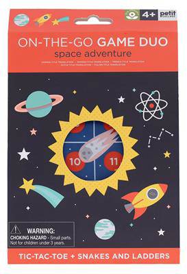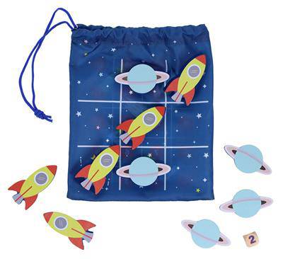 Travel the galaxy with two all-time favorite games! Players move planets and rockets across the grids printed on a handy travel bag in this fun and colorful cosmic take on the classic games of Tic-Tac-Toe and Snakes and Ladders. Set includes 10 wooden counters, a wooden die, and instructions in a compact on-the-go format.