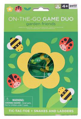 Get immersed in nature with two all-time favorite games! Players move bees and bugs across the grids printed on a handy travel bag in this fun and colorful take on the classic games of Tic-Tac-Toe and Snakes and Ladders. Set includes 10 wooden counters, a wooden die, and instructions in a compact on-the-go format.