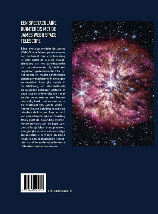 Sinds de lancering eind 2021 is de James Webb Space Telescope (JWST) het paradepaardje van de sterrenkunde. Als ‘opvolger’ van de succesvolle (en nog steeds operationele) Hubble Space Telescope biedt de nieuwe ruimtetelescoop een ongekend gedetailleerde blik op het heelal en maakt hij schitterende foto’s van planeten in ons eigen zonnestelsel, kleurrijke nevels in de Melkweg, en verre sterrenstelsels aan de rand van het universum. Niet eerder verscheen er een Nederlandse uitgave met zo veel materiaal van de James Webb. Aan de hand van de uitzonderlijke foto’s neemt sterauteur Govert Schilling ons mee op reis door de kosmos en gidst hij ons op zijn welbespraakte manier langs exoplaneten, supernova’s en zwarte gaten. Het ultieme cadeau voor de feestdagen.
