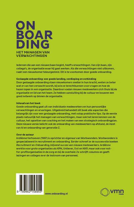 Iedereen die aan een nieuwe baan begint, heeft verwachtingen. Van zijn baan, zijn collega’s, de organisatie waar hij gaat werken. Als die verwachtingen niet uitkomen, raakt een nieuwkomer teleurgesteld. Dit is te voorkomen door goede onboarding. Geslaagde onboarding: een goede landing, verdieping en verbindingDoor geslaagde onboarding staan nieuwkomers sneller in hun kracht, weten ze beter wat er van hen verwacht wordt, bij wie ze terechtkunnen voor vragen en hoe de hazen lopen in een organisatie. Daardoor voelen nieuwe medewerkers zich thuis bij de organisatie en lid van het team. Ze hebben aansluiting bij de cultuur en bouwen een goed netwerk op binnen de organisatie. Inhoud van het boek Goede onboarding gaat uit van individuele medewerkers en hun persoonlijke verwachtingen en ervaringen. Uitgebreid behandelt dit boek alle aspecten die belangrijk zijn voor een geslaagde onboarding, met volop praktische tips. Op de eerste plaats natuurlijk het managen van verwachtingen, maar ook het leren kennen van de cultuur, het opzetten van coaching en het maken van een strategisch onboardingplan. Deze nieuwe versie belicht ook de onboarding van medewerkers op afstand, de inzet van AI en onboarding van generatie Z. Over de auteur Ardiënne Verhoeven (1967) is oprichter en eigenaar van Workwonders. Workwonders is gespecialiseerd in recruitment en onboarding. Eerder schreef ze de succesvolle boeken Recruitment en Onboarding, blijvend succes van nieuwe medewerkers. Ardiënne werkte voor grote organisaties als KPN, Unilever, Océ en NXP, maar ook voor notfor- profitorganisaties in de zorg en bij de overheid. Ze schrijft columns en geeft lezingen en colleges over de instroom van personeel.