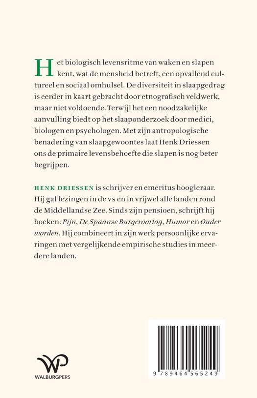 Het biologisch levensritme van waken en slapen kent, wat de mensheid betreft, een opvallend cultureel en sociaal omhulsel. De diversiteit in slaapgedrag is eerder in kaart gebracht door etnografisch veldwerk, maar niet voldoende. Terwijl het een noodzakelijke aanvulling biedt op het slaaponderzoek door medici, biologen en psychologen. Met zijn antropologische benadering van slaapgewoontes laat Henk Driessen ons de primaire levensbehoefte die slapen is nog beter begrijpen.