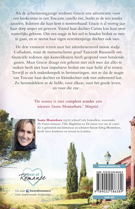 Een Italiaanse kookcursus in een Toscaans palazzo heeft verstrekkende gevolgenAls de achtenzestigjarige weduwe Gracie een advertentie voor een kookcursus in een Toscaans castello ziet, boekt ze de reis zonder aarzelen. Iedereen in het gehucht in Devon waar ze woont is stomverbaasd: Gracie is al veertig jaar haar dorp amper uit geweest. Vooral haar dochter Carina kan haar oren nauwelijks geloven. Om een oogje in het zeil te houden besluit ze mee te gaan, en ze neemt haar eigen zeventienjarige dochter ook mee.De drie vrouwen reizen naar het adembenemend mooie stadje Colladoro, waar de mensenschuwe graaf Tancredi Bassanelli om financiële redenen zijn kasteeldeuren heeft geopend voor betalende gasten. Maar Gracie draagt een geheim met zich mee. Een geheim dat zelfs haar dochter niet kent en dat alles te maken heeft met haar impulsieve besluit om naar Italië af te reizen. Terwijl ze zich onderdompelt in herinneringen – aan de liefde die ze verloor en aan de tragedie die haar deed terugkeren naar Engeland – ziet ze dat de magie van Toscane haar dochter en kleindochter ook niet onberoerd laat. Zo herontdekken ze de liefde, voor elkaar, voor het goede leven, en voor die ene…De pers over Santa Montefiore