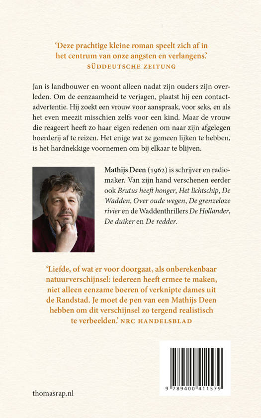 Jan is landbouwer en woont alleen nadat zijn ouders zijn overleden. Om de eenzaamheid te verjagen, plaatst hij een contactadvertentie. Hij zoekt een vrouw voor aanspraak, voor seks, en als het even meezit misschien zelfs voor een kind. Maar de vrouw die reageert heeft zo haar eigen redenen om naar zijn afgelegen boerderij af te reizen. Het enige wat ze gemeen lijken te hebben, is het hardnekkige voornemen bij elkaar te blijven.