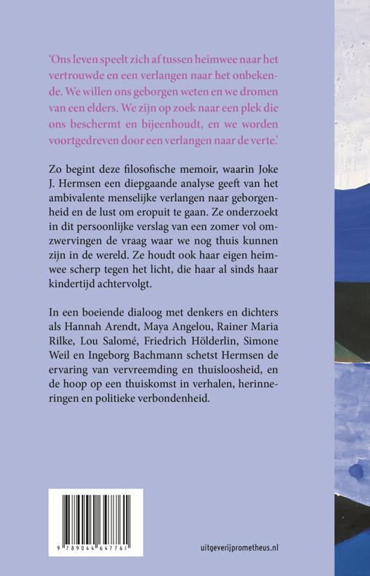 Zo begint deze filosofische memoir, waarin Joke J. Hermsen een diepgaande analyse geeft van het ambivalente menselijke verlangen naar geborgenheid en de lust om eropuit te gaan. Ze onderzoekt in dit persoonlijke verslag van een zomer vol omzwervingen de vraag waar we nog thuis kunnen zijn in de wereld. Ze houdt ook haar eigen heimwee scherp tegen het licht, die haar al sinds haar kindertijd achtervolgt.