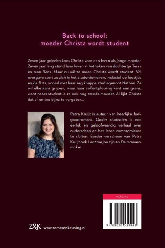 De feelgoodroman 'Onder studenten' van Petra Kruijt gaat over een jonge moeder en de keuzes en compromissen die bij ouderschap komen kijken. Zeven jaar geleden koos hoofdpersoon Christa voor een leven als jonge moeder. Zeven jaar lang stond haar leven in het teken van dochtertje Tessa en man Rens. Maar nu wil ze meer: Christa wordt student. Vol overgave stort ze zich in het studentenleven, inclusief de feestjes en de flirts, vooral met haar erg knappe studiegenoot Nathan. Maar haar zelfontplooiing kent een grens, want naast student is ze ook nog steeds moeder. Al lijkt Christa dat af en toe bijna te vergeten… Naast schrijfster en redacteur moet Petra Kruijt ook tijd vrijmaken voor haar twee dochtertjes. 'Onder studenten' is een eerlijke en geloofwaardige feelgood over ouderschap en het leren compromissen te sluiten. Eerder verschenen al van Petra Kruijt 'Lieve ik' en 'Laat me jou zijn'.