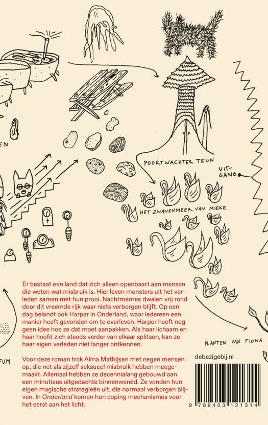 Voor deze roman trok Alma Mathijsen met negen mensen op, die net als zijzelf seksueel misbruik hebben meegemaakt. Allemaal hebben ze decennialang gebouwd aan een minutieus uitgedachte binnenwereld. Ze vonden hun eigen magische strategieën uit, die normaal verborgen blijven. In Onderland komen hun coping mechanismes voor het eerst aan het licht.