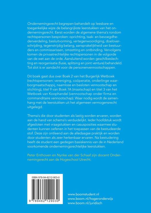 Ondernemingsrecht begrepen behandelt op leesbare en toegankelijke wijze de belangrijkste leerstukken van het ondernemingsrecht. Eerst worden de algemene thema's rondom rechtspersonen besproken: oprichting, taak- en bevoegdhedenverdeling, besluitvorming, vertegenwoordiging, doeloverschrijding, tegenstrijdig belang, aansprakelijkheid van bestuurders en commissarissen, omzetting en ontbinding. Vervolgens komen de privaatrechtelijke rechtspersonen in de volgorde van de wet aan de orde. Aansluitend worden geschilbeslechting en reorganisatie (fusie, splitsing en joint venture) behandeld. Tot slot is er aandacht voor de personenvennootschappen. Dit boek gaat dus over Boek 2 van het Burgerlijk Wetboek (rechtspersonen: vereniging, coperatie, onderlinge waarborgmaatschappij, naamloze en besloten vennootschap en stichting), titel 9 van Boek 7A (maatschap) en titel 3 van het Wetboek van Koophandel (vennootschap onder firma en commanditaire vennootschap). Waar nodig wordt de samenhang met de leerstukken uit het algemeen vermogensrecht uitgelegd. Thema's die door studenten als lastig worden ervaren, worden aan de hand van schema's verduidelijkt. Ieder hoofdstuk wordt afgesloten met vraagstukken en casusposities waarmee studenten kunnen oefenen in het toepassen van de bestudeerde stof. Deze zijn ontleend aan de alledaagse praktijk en worden door studenten als zeer herkenbaar ervaren. Na bestudering heeft de student een gedegen basiskennis van de in Nederland voorkomende ondernemingsrechtelijke leerstukken. Peter Enthoven en Nynke van der Schaaf zijn docent Ondernemingsrecht aan de Hogeschool Utrecht.