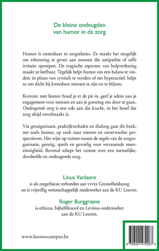 Humor is onmisbaar in zorgrelaties. Ze maakt het mogelijk om erkenning te geven aan mensen die antipathie of zelfs irritatie oproepen. De tragische aspecten van hulpverlening maakt ze leefbaar. Tegelijk helpt humor om een balans te vinden: in plaats van cynisch te worden of net hyperactief, helpt ze om dicht bij kwetsbare mensen te zijn en te blijven.