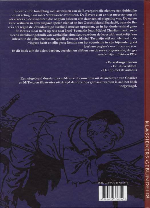 In de vijfde bundeling met avonturen van de Beverpatroelje zien we een duidelijke ontwikkeling naar meer ‘volwassen’ avonturen. De Bevers zien er niet meer zo jong uit als eerder en de avonturen die ze gaan beleven zijn daar een afspiegeling van. De eerste twee verhalen in deze uitgave spelen zich af in het Oostblokland Braslavië, waar de Bevers het tegen de kwaadaardige overheid moeten opnemen, en in het derde verhaal gaan de Bevers maar liefst op reis naar Iran! Scenarist Jean-Michel Charlier maakt zoals steeds dankbaar gebruik van werkelijke situaties, waardoor de lezer zich makkelijk kan inleven in de gebeurtenissen, terwijl tekenaar Michel Tacq zijn stijl nu helemaal in de vingers heeft en zijn grote kennis van het scoutisme in zijn bijzonder goed leesbare pagina’s weet te verwerken.