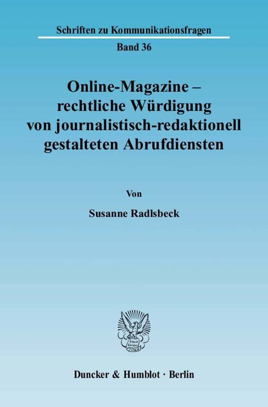 Susanne Radlsbeck unternimmt eine umfassende verfassungsrechtliche und einfachgesetzliche Würdigung von Online-Abrufdiensten, die Inhalte zur öffentlichen Meinungsbildung anbieten.