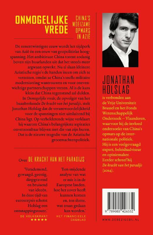 In Onmogelijke vrede, de opvolger van het baanbrekende De kracht van het paradijs, stelt Jonathan Holslag dat de verantwoordelijkheid voor de spanningen niet uitsluitend bij China ligt. Op verhelderende wijze verklaart hij waarom, vele goede intenties ten spijt, China’s belangrijkste aspiraties onverzoenbaar blijven met die van zijn buren. Dat is de nieuwe tragedie van de Aziatische grootmachtenpolitiek.