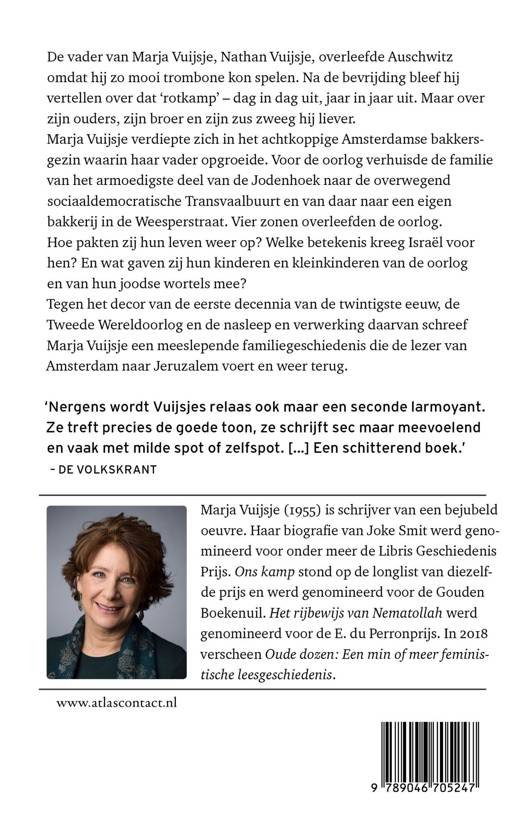 De vader van Marja Vuijsje, Nathan Vuijsje, overleefde Auschwitz omdat hij zo mooi trombone kon spelen. Na de bevrijding bleef hij vertellen over dat 'rotkamp' – dag in dag uit, jaar in jaar uit. Maar over zijn ouders, zijn broer en zijn zus zweeg hij liever. Marja Vuijsje verdiepte zich in het achtkoppige Amsterdamse bakkersgezin waarin haar vader opgroeide. Voor de oorlog verhuisde de familie van het armoedigste deel van de Jodenhoek naar de overwegend sociaaldemocratische Transvaalbuurt en van daar naar een eigen bakkerij in de Weesperstraat. Vier zonen overleefden de oorlog. Hoe pakten zij hun leven weer op? Welke betekenis kreeg Israel voor hen? En wat gaven zij hun kinderen en kleinkinderen van de oorlog en van hun joodse wortels mee? Tegen het decor van de eerste decennia van de twintigste eeuw, de Tweede Wereldoorlog en de nasleep en verwerking daarvan schreef Marja Vuijsje een meeslepende familiegeschiedenis die de lezer van Amsterdam naar Jeruzalem voert en weer terug.