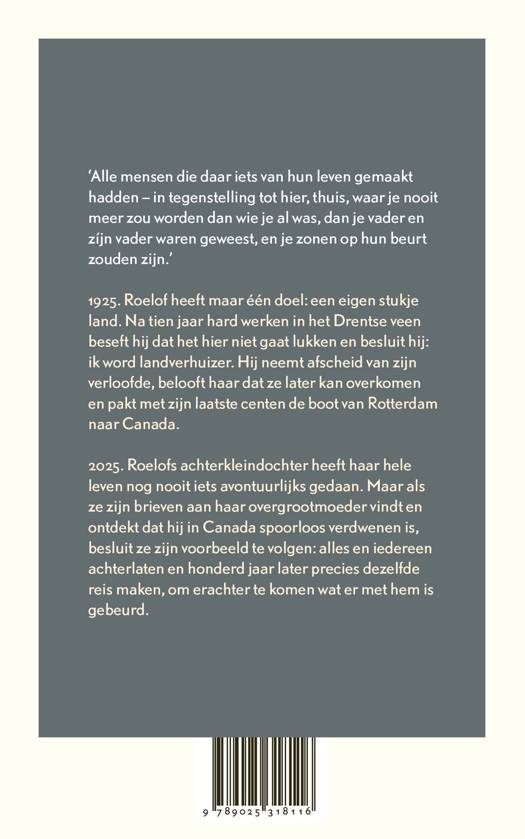2025. Roelofs achterkleindochter heeft haar hele leven nog nooit iets avontuurlijks gedaan. Maar als ze zijn brieven aan haar overgrootmoeder vindt en ontdekt dat hij in Canada spoorloos verdwenen is, besluit ze zijn voorbeeld te volgen: alles en iedereen achterlaten en honderd jaar later precies dezelfde reis maken, om erachter te komen wat er met hem is gebeurd.