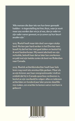 1925. Roelof heeft maar één doel: een eigen stukje land. Na tien jaar hard werken in het Drentse veen beseft hij dat het hier niet gaat lukken en besluit hij: ik word landverhuizer. Hij neemt afscheid van zijn verloofde, belooft haar dat ze later kan overkomen en pakt met zijn laatste centen de boot van Rotterdam naar Canada.
