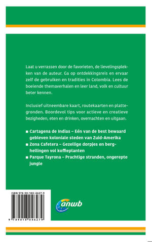 ANWB Ontdek reisgids ColombiaVerken Colombia op een andere manier met de uitgebreide ANWB Ontdek reisgids Colombia! Natuurlijk mag je de bezienswaardigheden in steden zoals Bogota en Medellin niet missen. Maar ga ook eens van de gebaande paden en wandel de Camino Real van Barichara naar Guane, neem een verfrissende duik in de helderblauwe Pozos Azules of laat je verrassen door de rode en grijze rotsformaties van de Tatacoa-woestijn.Deze reisgids biedt naast praktische tips over routes, hotels en vervoer ook originele ontdekkingstochten door het land. De auteur laat juist díe plekjes zien waar de andere toeristen aan voorbij lopen. Achter in de handzame gids zit een uitneembare kaart. Kortom: deze reisgids is een onmisbare reisgezel tijdens je rondreis door Colombia!