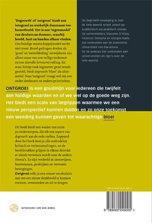 "Het verdient krediet voor zijn vermogen nieuwe vormen van sociale mobilisatie te entameren die aantrekkelijk zijn voor al wie 'groei' blijft zien als een valse oplossing voor maatschappelijke problemen en een ware ramp voor het milieu" Stefania Barca, Coimbra "Een baanbrekende verkenning van degrowtheconomie en -beleid. Het zal een mijlpaal worden voor al wie de groeifetsj wil ontstijgen" James Gustave Speth