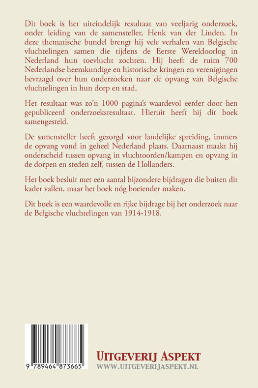 Dit boek is het uiteindelijk resultaat van veeljarig onderzoek, onder leiding van de samensteller, Henk van der Linden. In deze thematische bundel brengt hij vele verhalen van Belgische vluchtelingen samen die tijdens de Eerste Wereldoorlog in Nederland hun toevlucht zochten. Hij heeft de ruim 700 Nederlandse heemkundige en historische kringen en verenigingen bevraagd over hun onderzoeken naar de opvang van Belgische vluchtelingen in hun dorp en stad.