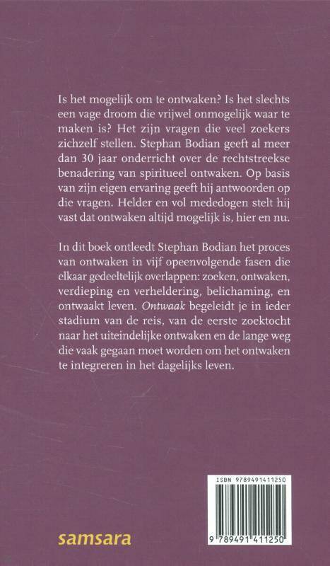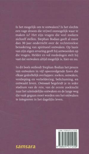 In dit boek ontleedt Stephan Bodian het proces van ontwaken in vijf opeenvolgende fasen die elkaar gedeeltelijk overlappen: zoeken, ontwaken, verdieping en verheldering, belichaming, en ontwaakt leven. Ontwaak begeleidt je in ieder stadium van de reis, van de eerste zoektocht naar het uiteindelijke ontwaken en de lange weg die vaak gegaan moet worden om het ontwaken te integreren in het dagelijks leven.