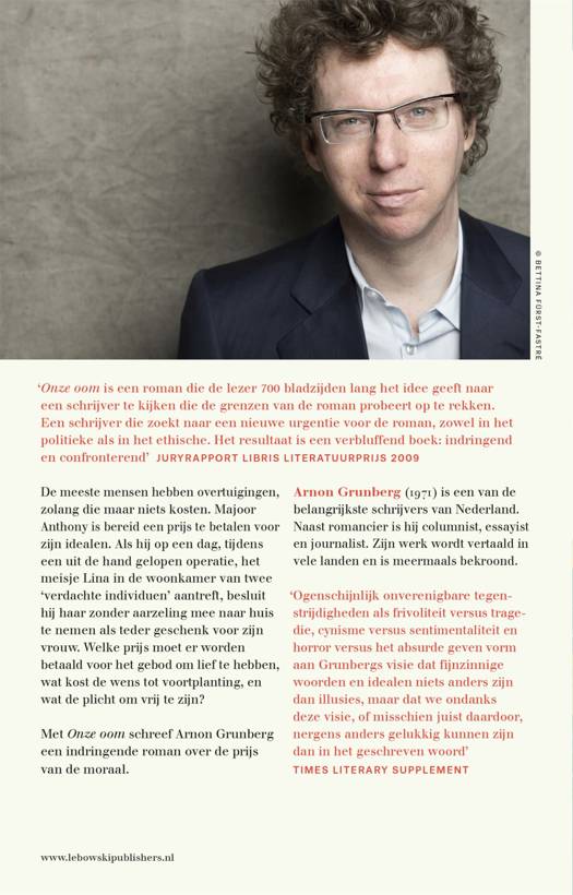 Als je kunt doden op commando, dan kun je ook liefhebben op commando. De meeste mensen hebben overtuigingen, zolang die maar niets kosten. Majoor Anthony is bereid een prijs te betalen voor zijn idealen. Als hij op een dag, tijdens een uit de hand gelopen operatie, het meisje Lina in de woonkamer van twee verdachte individuen aantreft, besluit hij haar zonder aarzeling mee naar huis te nemen als teder geschenk voor zijn vrouw.Onze oom is het verhaal van een meisje dat als een dode onder de levenden verkeert, van een majoor die zijn schaamte alleen kan overwinnen door heldendom na te streven en van een opstandelingenleider voor wie de revolutie een door hem te regisseren opera is.Welke prijs moet er worden betaald voor het gebod om lief te hebben, wat kost de wens tot voortplanting, en wat de plicht om vrij te zijn? Met Onze oom schreef Arnon Grunberg een indringende roman over de prijs van de moraal. 'Oorlog, dat was vrijheid. De rest was amusement.'
