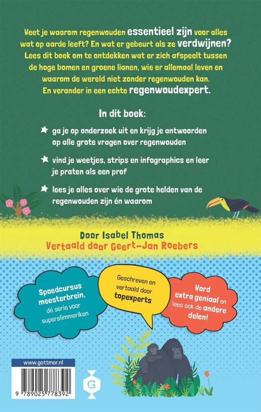 In dit zesde deel van de informatieve serie Spoedcursus meesterbrein ontdek je alle geheimen van de wondere wereld van het regenwoud. De regenwouden beslaan een enorm deel van onze aarde en herbergen een ongelooflijke diversiteit aan leven. Wist je dat er in de regenwouden talloze plant- en diersoorten wonen die nog niet zijn geïdentificeerd? Wil je meer te weten komen over de verbazingwekkende flora en fauna die in deze ecosystemen gedijen, evenals begrijpen waarom regenwouden van onschatbare waarde zijn voor onze planeet? Lees dan dit boek en word een regenwoudexpert. Ontdek boeiende feiten, illustratieve strips en informatieve infographics om een echte kenner te worden. Leer alles over de helden van de regenwouden en waarom ze van cruciaal belang zijn. Krijg antwoord op al je vragen over deze weelderige ecosystemen. Dit leerzame deel is vakkundig vertaald door bioloog Geert-Jan Roebers, een van de meest vooraanstaande Nederlandse schrijvers van literaire non-fictie voor kinderen.