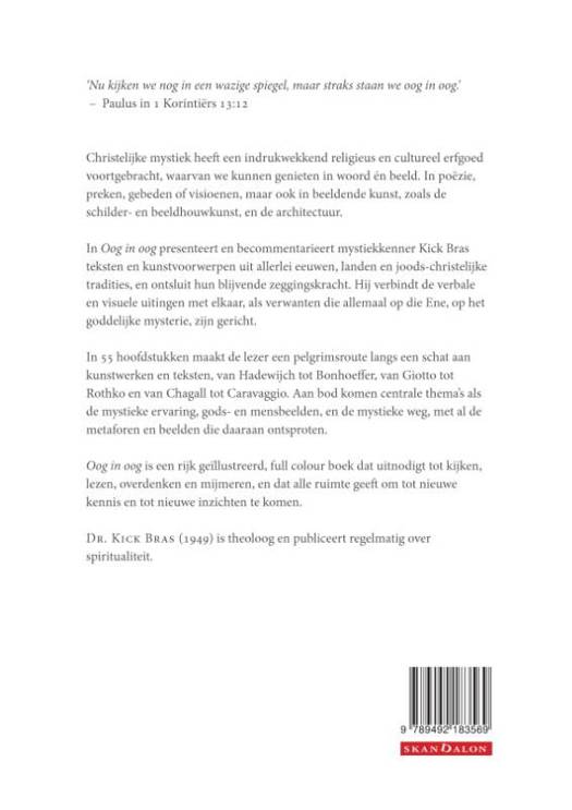In Oog in oog presenteert en becommentarieert mystiekkenner Kick Bras teksten en kunstvoorwerpen uit allerlei eeuwen, landen en joods-christelijke tradities, en ontsluit hun blijvende zeggingskracht. Hij verbindt de verbale en visuele uitingen met elkaar, als verwanten die allemaal op die Ene, op het goddelijke mysterie, zijn gericht.