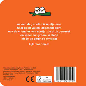 Na een dag spelen is nijntje moe en vallen haar oogjes langzaam dicht. Ook haar vriendjes zijn slaperig geworden van al hun avonturen. Als je de pagina's omslaat zie je hoe ze één voor één hun ogen sluiten.