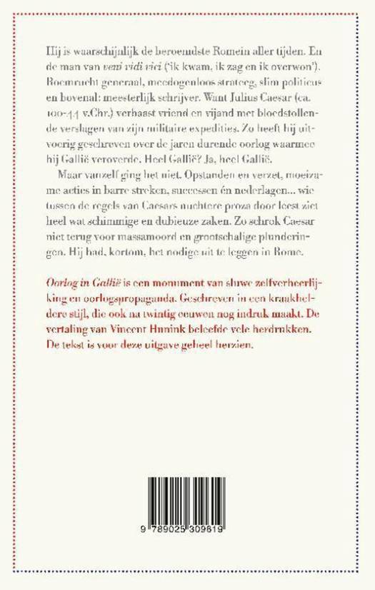 Oorlog in Gallië is een monument van sluwe zelfverheerlijking en oorlogspropaganda. Geschreven in een kraakheldere stijl, die ook na twintig eeuwen nog indruk maakt. De vertaling van Vincent Hunink kende vele herdrukken en is voor deze uitgave geheel herzien.
