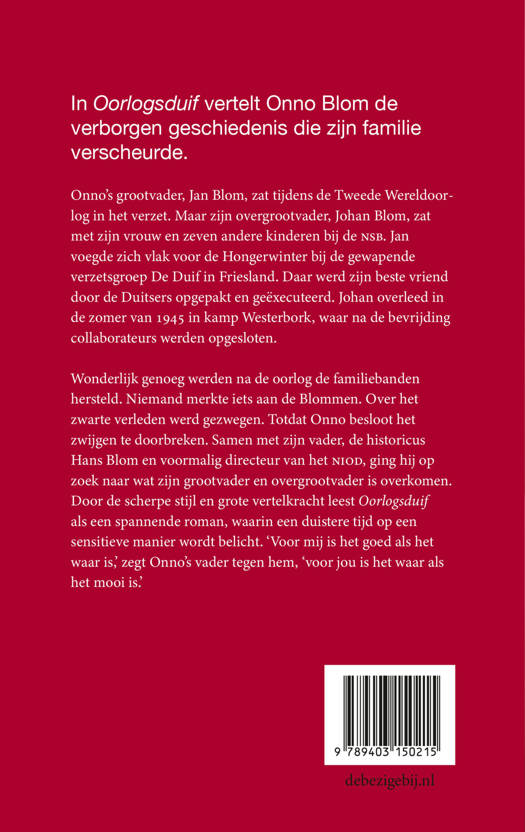 Wonderlijk genoeg werden na de oorlog de familiebanden hersteld. Niemand merkte iets aan de Blommen. Over het zwarte verleden werd gezwegen. Totdat Onno besloot het zwijgen te doorbreken. Samen met zijn vader, de historicus Hans Blom en voormalig directeur van het NIOD, ging hij op zoek naar wat zijn grootvader en overgrootvader is overkomen. Door de scherpe stijl en grote vertelkracht leest Oorlogsduif als een spannende roman, waarin een duistere tijd op een sensitieve manier wordt belicht. ‘Voor mij is het goed als het waar is,’ zegt Onno’s vader tegen hem, ‘voor jou is het waar als het mooi is.’