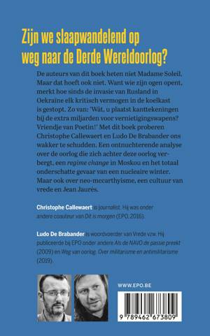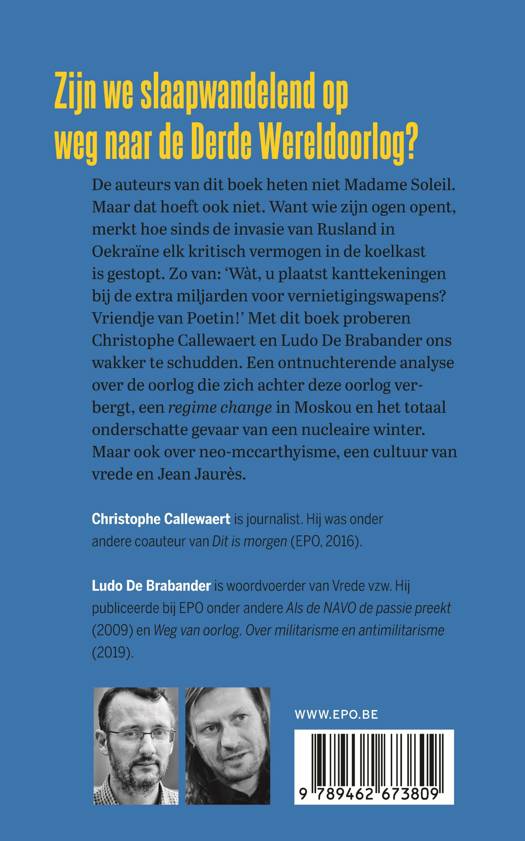 Zijn we slaapwandelend op weg naar de Derde Wereldoorlog? De auteurs van dit boek heten niet Madame Soleil. Maar dat hoeft ook niet. Want wie zijn ogen opent, merkt hoe sinds de invasie van Rusland in Oekraïne elk kritisch vermogen in de koelkast is gestopt. Zo van: ‘Wàt, u plaatst kanttekeningen bij de extra miljarden voor vernietigingswapens? Vriendje van Poetin!’ Met dit boek proberen Christophe Callewaert en Ludo De Brabander ons wakker te schudden. Een ontnuchterende analyse over de oorlog die zich achter deze oorlog verbergt en het totaal onderschatte gevaar van een nucleaire winter. Maar ook over neo-mccarthyisme, een cultuur van vrede en Jean Jaurès.