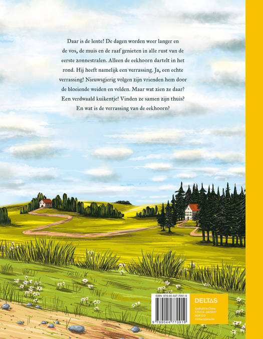 Daar is de lente! De dagen worden weer langer en de vos, de muis en de raaf genieten in alle rust van de eerste zonnestralen. Alleen de eekhoorn dartelt in het rond. Hij heeft namelijk een verrassing. Ja, een echte verrassing! Nieuwsgierig volgen zijn vrienden hem door de bloeiende weiden en velden. Maar wat zien ze daar? Een verdwaald kuikentje! Vinden ze samen zijn thuis? En wat is de verrassing van de eekhoorn?