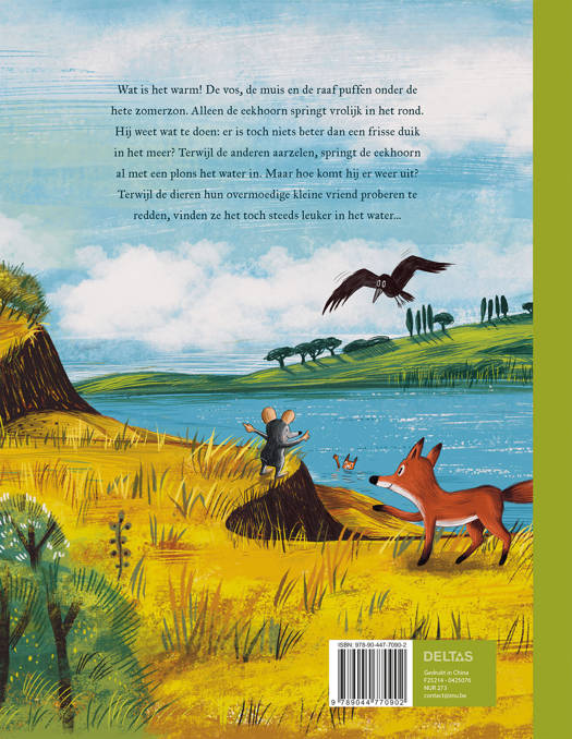 Wat is het warm! De vos, de muis en de raaf puffen onder de hete zomerzon. Alleen de eekhoorn springt vrolijk in het rond. Hij weet wat te doen: er is toch niets beter dan een frisse duik in het meer? Terwijl de anderen aarzelen, springt de eekhoorn al met een plons het water in. Maar hoe komt hij er weer uit? Terwijl de dieren hun overmoedige kleine vriend proberen te redden, vinden ze het toch steeds leuker in het water…