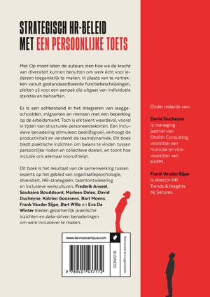 Dit boek is het resultaat van de samenwerking tussen experts op het gebied van organisatiepsychologie, diversiteit, HR-strategieën, talentontwikkeling en inclusieve werkculturen. Frederik Anseel, Soukaina Bouddount, Marleen Deleu, David Ducheyne, Katrien Goossens, Bart Moens, Frank Vander Sijpe, Bart Wille en Eva De Winter bieden gezamenlijk praktische inzichten en data-driven benaderingen om werk inclusiever te maken.