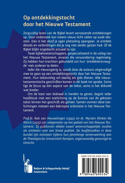 Zorgvuldig lezen van de Bijbel levert verrassende ontdekkingen op. Door onderzoek kan ineens nieuw licht vallen op oude teksten. Dan is het alsof je ogen plotseling opengaan. Je ontdekt details en verbindingen die je nog niet eerder gezien had. Of de Bijbel blijkt ongedacht actueel te zijn. Twee bijbelwetenschappers, gespecialiseerd in de uitleg van het Nieuwe Testament, ervaren die verwondering regelmatig. Zij hebben hun krachten gebundeld om hun ‘ontdekkersvreugde’ met anderen te delen. Ieder die nieuwsgierig is, wordt door de auteurs uitgenodigd mee te gaan op een ontdekkingstocht door het Nieuwe Testament. Hun tekstuitleg wil daarbij als gids dienen. Alle nieuwtestamentische geschriften komen in dit boek ter sprake. Soms ligt de focus op één aspect van de tekst, soms is het blikveld wat breder. Om de lezer een leidraad in handen te geven, begint ieder hoofdstuk met een toelichting op de functie van de gekozen tekst binnen het geschrift als geheel. Samen vormen deze toelichtingen meteen een beknopte oriëntatie in het Nieuwe Testament.