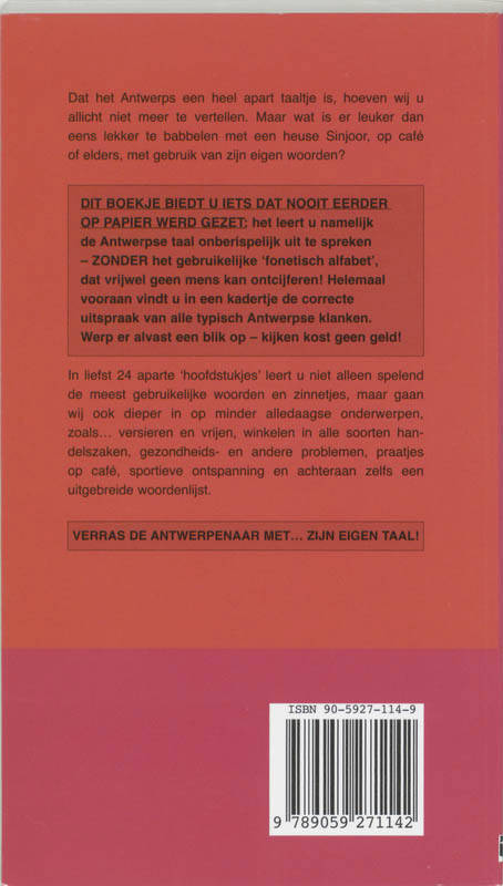 Dit boekje leert u namelijk de Antwerpse taal onberispelijk uit te spreken, zonder het gebruikelijke 'fonetisch alfabet', dat vrijwel geen mens dan ontcijferen! Helemaal vooraan vindt u in een kadertje de correcte uitspraak van alle typisch Antwerpse klanken. In liefst 24 aparte hoofdstukjes leert u niet alleen spelen de meest gebruikelijke woorden en zinnetjes, maar gaan wij ook dieper in op minder alledaagse onderwerpen, zoals versieren en vrijen, winkelen in alle soorten handelszaken, gezondheids- en andere problemen, praatjes op café, sportieve ontspanning en achteraan zelfs een woordenlijst.