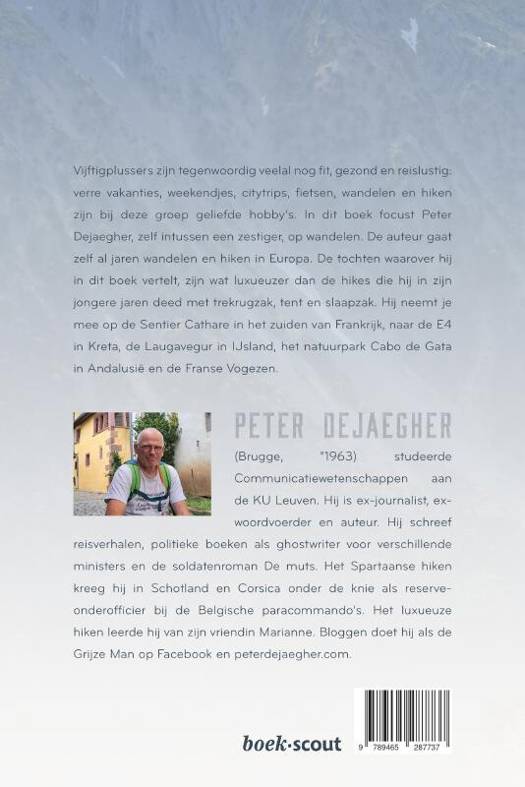 Vijftigplussers zijn tegenwoordig veelal nog fit, gezond en reislustig: verre vakanties, weekendjes, citytrips, fietsen, wandelen en hiken zijn bij deze groep geliefde hobby’s. In dit boek focust Peter Dejaegher, zelf intussen een zestiger, op wandelen. De auteur gaat zelf al jaren wandelen en hiken in Europa. De tochten waarover hij in dit boek vertelt, zijn wat luxueuzer dan de hikes die hij in zijn jongere jaren deed met trekrugzak, tent en slaapzak. Hij neemt je mee op de Sentier Cathare in het zuiden van Frankrijk, naar de E4 in Kreta, de Laugavegur in IJsland, het natuurpark Cabo de Gata in Andalusië en de Franse Vogezen.
