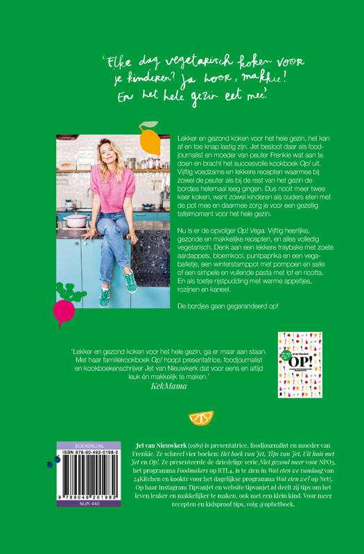 Nu is er de opvolger Op! Vega. Vijftig heerlijke, voedzame en makkelijke recepten, en alles volledig vegetarisch. Denk aan een gezonde en heerlijke traybake met zoete aardappel, bloemkool, puntpaprika en een vegaballetje, een winterstamppot met pompoen en salie of een simpele en vullende pasta met lof en ricotta. En als toetje rijstpudding met warme appeltjes, rozijnen en kaneel. De bordjes gaan gegarandeerd op!