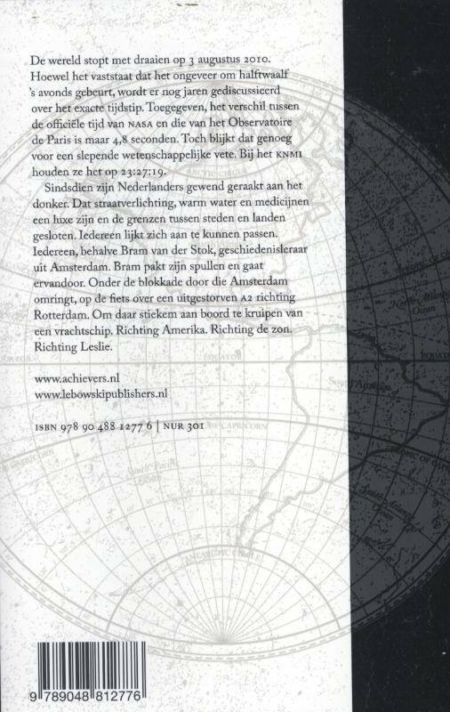 De wereld stopt met draaien op 3 augustus 2010. Hoewel het vaststaat dat het ongeveer om halftwaalf 's avonds gebeurt, wordt er nog jaren gediscussieerd over het exacte tijdstip. Toegegeven, het verschil tussen de officiële tijd van NASA en die van het Observatoire de Paris is maar 4,8 seconden. Toch blijkt dat genoeg voor een slepende wetenschappelijke vete. Bij het KNMI houden ze het op 23:27:19. Sindsdien zijn Nederlanders gewend geraakt aan het donker. Dat straatverlichting, warm water en medicijnen een luxe zijn en de grenzen tussen steden en landen gesloten. Iedereen lijkt zich aan te kunnen passen.