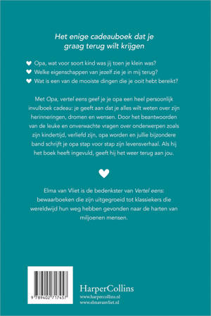 Met Opa, vertel eens geef je je opa een ultiem invulboek cadeau: je geeft aan dat je alles wilt weten over zijn herinneringen, dromen en wensen. Door het invullen van de leuke en onverwachte vragen over onderwerpen zoals zijn kindertijd, verliefd zijn, opa worden en de bijzondere band tussen opa en kleinkind, schrijft je opa stap voor stap zijn levensverhaal. Of maak het nog specialer door het boek samen in te vullen en in gesprek te gaan. Zo ontstaat er een uniek en persoonlijk boek van jullie samen. Als je opa het boek heeft ingevuld, geeft hij het weer terug aan jou.