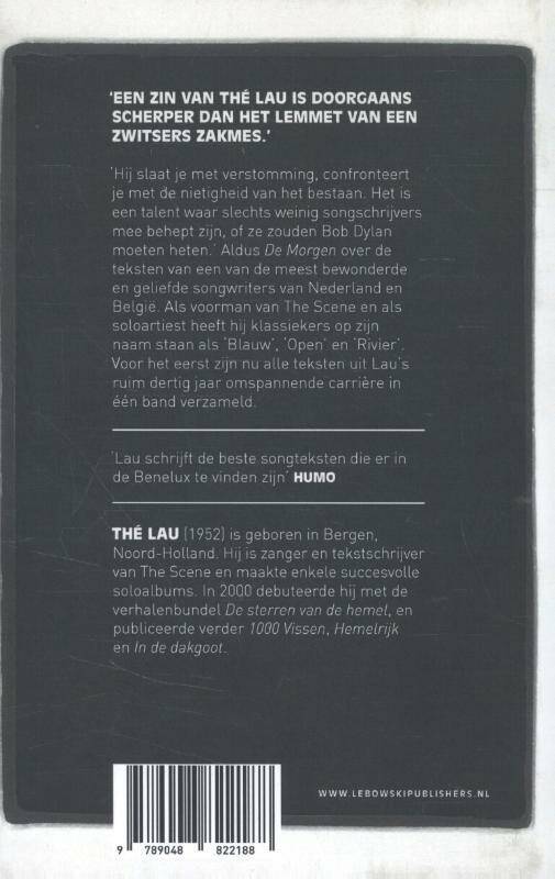'Hij slaat je met verstomming, confronteert je met de nietigheid van het bestaan. Het is een talent waar slechts weinig songschrijvers mee behept zijn, of ze zouden Bob Dylan moeten heten.' Aldus De Morgen over de teksten van een van de meest bewonderde en geliefde songwriters van Nederland en België. Als voorman van The Scene en als soloartiest heeft hij klassiekers op zijn naam staan als 'Blauw', 'Open' en 'Rivier'. Voor het eerst zijn nu alle teksten uit Lau's ruim dertig jaar omspannende carrière in één band verzameld.