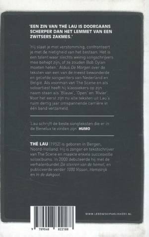 THÉ LAU (1952) is geboren in Bergen, Noord-Holland. Hij is zanger en tekstschrijver van The Scene en maakte enkele succesvolle soloalbums. In 2000 debuteerde hij met de verhalenbundel De sterren van de hemel, en publiceerde verder 1000 Vissen, Hemelrijk en In de dakgoot.