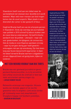 Bracke heeft een van de scherpste pennen in Vlaanderen. Sinds zijn overstap van journalistiek naar politiek in 2010, schreef hij talloze stukken over de meest diverse onderwerpen. Hij werpt een kritische blik op de politiek – uiteraard – maar ook op goede boeken, de tijdsgeest, de coronacrisis. Ook de media en onze Vlaamse openbare omroep – waar hij net geen dertig jaar heeft gewerkt – ontsnappen niet aan zijn arendsoog. Zijn hele leven lang was hij een bevoorrecht waarnemer. In Open het debat! verwerkt Bracke nu wat hem is bijgebleven uit een rijkgevuld leven vol gulzig lezen, kijken en luisteren.