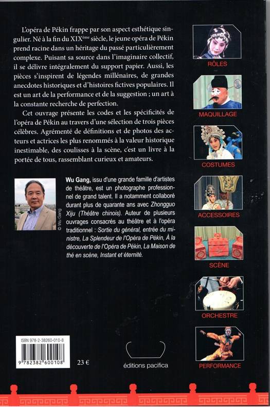 L’opéra de Pékin frappe par son aspect esthétique singulier. Né à la fin du XIXème siècle, le jeune opéra de Pékin prend racine dans un héritage du passé particulièrement complexe. Puisant sa source dans l’imaginaire collectif, il se délivre intégralement du support papier. Aussi, les pièces s’inspirent de légendes millénaires, de grandes anecdotes historiques et d’histoires fictives populaires. Il est un art de la performance et de la suggestion ; un art à la constante recherche de perfection. Cet ouvrage présente les codes et les spécificités de l’opéra de Pékin au travers d’une sélection de trois pièces célèbres. Agrémenté de définitions et de photos des acteurs et actrices les plus renommés à la valeur historique inestimable, des coulisses à la scène, c'est un livre à la portée de tous, rassemblant curieux et amateurs. Wu Gang, issu d'une grande famille d'artistes de théâtre, est un photographe professionnel de grand talent. Il a notamment collaboré durant plus de quarante ans avec Zhongguo Xiju (Théâtre chinois). Auteur de plusieurs ouvrages consacrés au théâtre et à l'opéra traditionnel : Sortie du général, entrée du ministre, La Splendeur de l'Opéra de Pékin, à la découverte de l'Opéra de Pékin, La Maison de thé en scène, Instant et éternité.