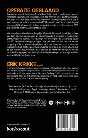 Een ruime meerderheid van de bevolking krijgt ooit te maken met een of meerdere traumatische ervaringen. Een deel hiervan krijgt posttraumatische klachten. Vaak zijn deze kortdurend, maar voor sommigen geldt echter dat zij een posttraumatische stressstoornis (PTSS) ontwikkelen. Voor zowel degene die eraan lijdt, als voor zijn of haar omgeving is het gevecht een tegen PTSS een keiharde, maar vaak onzichtbare strijd.Hartverscheurend en hoopvol tegelijk. ‘Operatie Geslaagd’ vertelt het verhaal van Erik, die tijdens zijn werk als operatieassistent chirurgie in Afghanistan getraumatiseerd raakte. Hij beschrijft de ervaringen die aanleiding gaven tot PTSS en de vernietigende impact die het heeft op een persoon en zijn omgeving. Erik vertelt openhartig hoe hij in een isolement terechtkwam en langzaam afbrak tot het punt kwam waarop zelfmoord de enige uitweg leek te zijn. Als medicus, veteraan, maar bovenal als mens vertelt hij over hoe hij de strijd is aangegaan met zichzelf en zijn herinneringen en hoe hij inmiddels weer middenin het leven staat.Op meerdere plekken in het boek vindt u een unieke (QR en Spotify) code. Zodra u deze met uw telefoon scant, kunt u een liedje (of een deel ervan) luisteren dat past bij het moment in het verhaal.