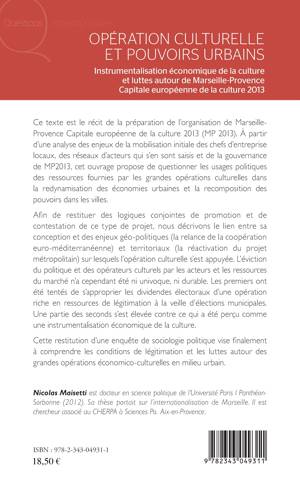 Ce texte est le récit de la préparation de l'organisation de Marseille-Provence Capitale européenne de la culture 2013. A partir d'une analyse des enjeux de la mobilisation initiale des chefs d'entreprise locaux, des réseaux d'acteurs qui s'en sont saisis et de la gouvernance de MP2013, cet ouvrage propose de questionner les usages politiques des ressources fournies par les grandes opérations culturelles dans la redynamisation des économies urbaines et la recomposition des pouvoirs dans la ville.