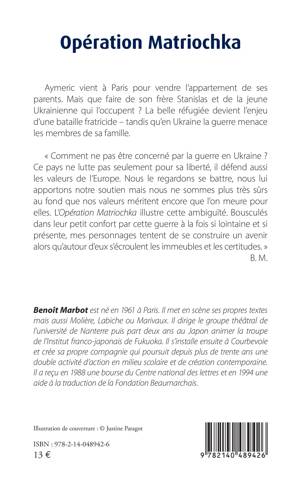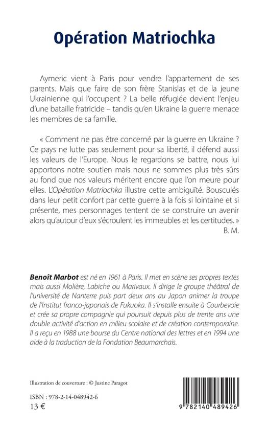 Aymeric vient à Paris pour vendre l'appartement de ses parents. Mais que faire de son frère Stanislas et de la jeune Ukrainienne qui l'occupent ? La belle réfugiée devient l'enjeu d'une bataille fratricide tandis qu'en Ukraine la guerre menace les membres de sa famille. « Comment ne pas être concerné par la guerre en Ukraine ? Ce pays ne lutte pas seulement pour sa liberté, il défend aussi les valeurs de l'Europe. Nous le regardons se battre, nous lui apportons notre soutien mais nous ne sommes plus très sûrs au fond que nos valeurs méritent encore que l'on meure pour elles. L'Opération Matriochka illustre cette ambiguïté. Bousculés dans leur petit confort par cette guerre à la fois si lointaine et si présente, mes personnages tentent de se construire un avenir alors qu'autour d'eux s'écroulent les immeubles et les certitudes. » B. M.